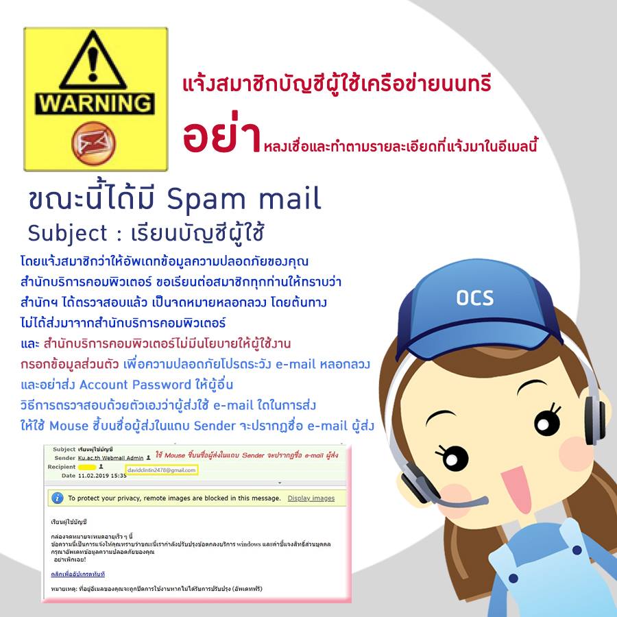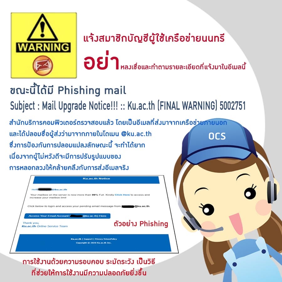ด้วยขณะนี้ มีอีเมล์แอบอ้างเป็นอาจารย์ของมหาวิทยาลัยเกษตรศาสตร์ ได้เรียกเก็บเงินจากนิสิตต่างชาติ เพื่อให้สามารถมาเรียนที่มหาวิทยาลัยเกษตรศาสตร์ สำนักบริการคอมพิวเตอร์ขอให้อาจารย์ บุคลากร และนิสิต มก. เพิ่มความระมัดระวังป้องกันและรับมือกับภัยคุกคามทางอีเมล์ โดย 5 วิธีหลัก ๆ ดังนี้