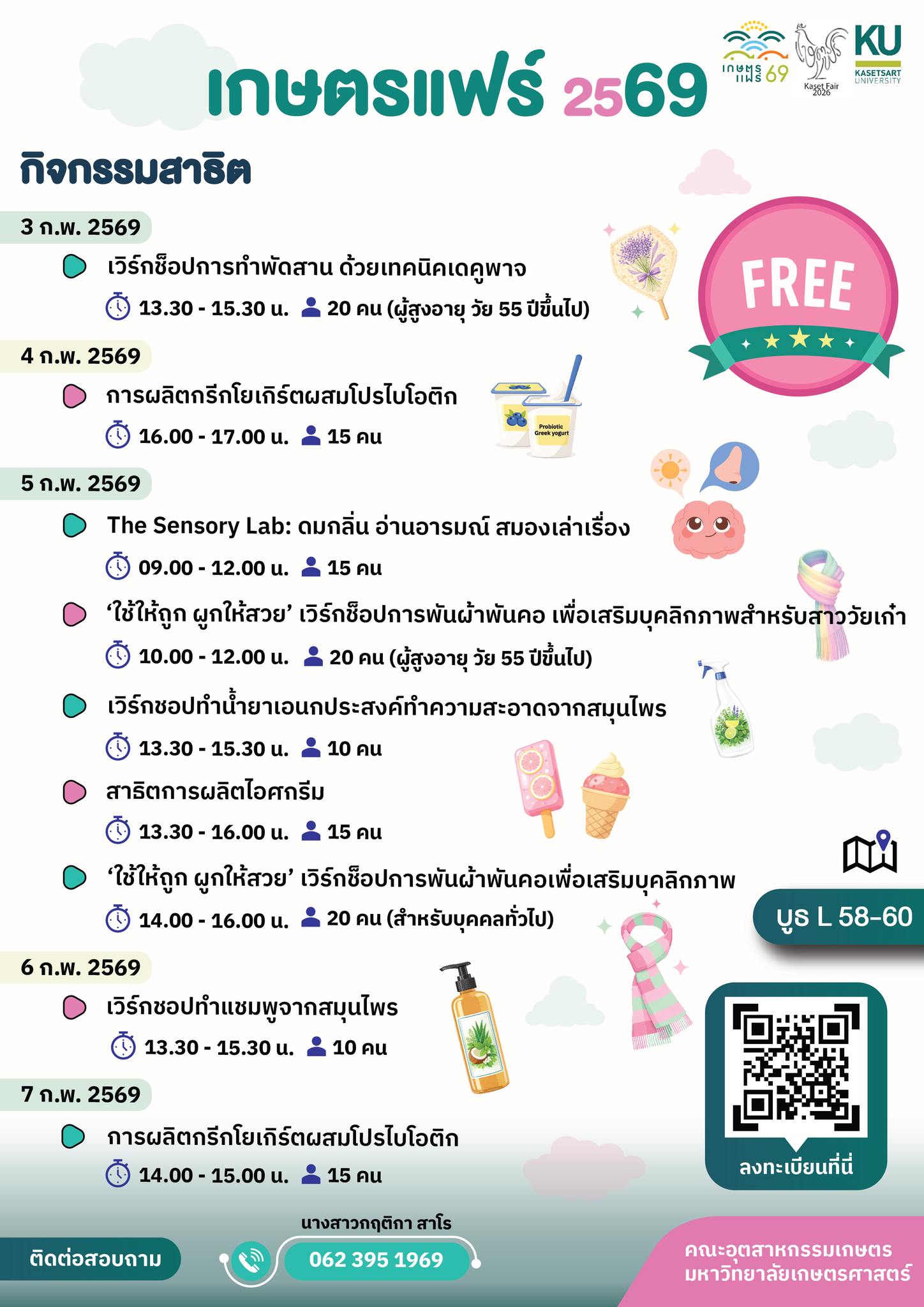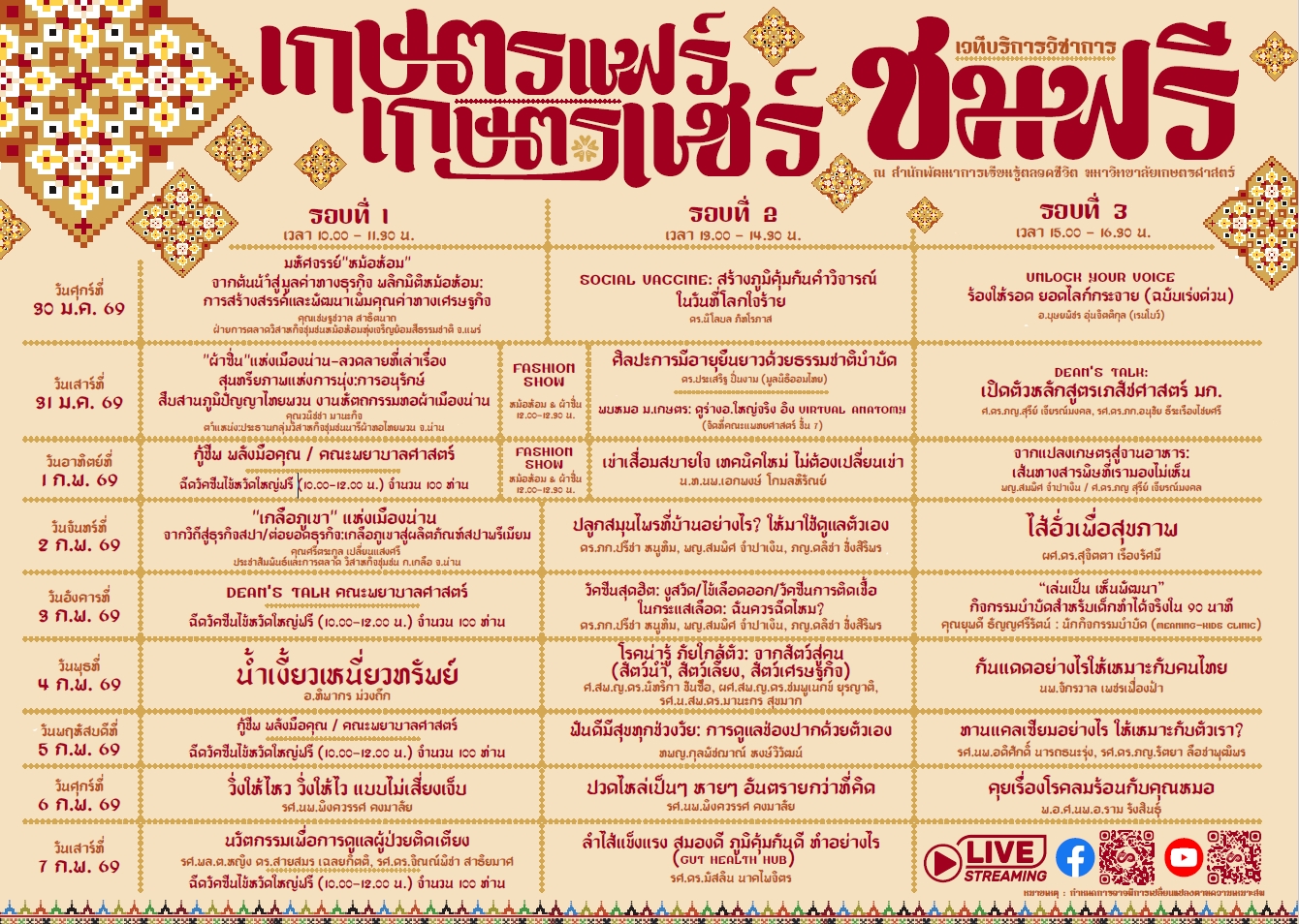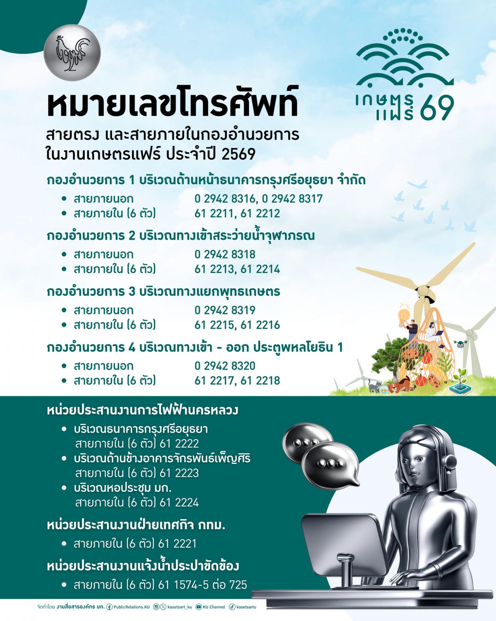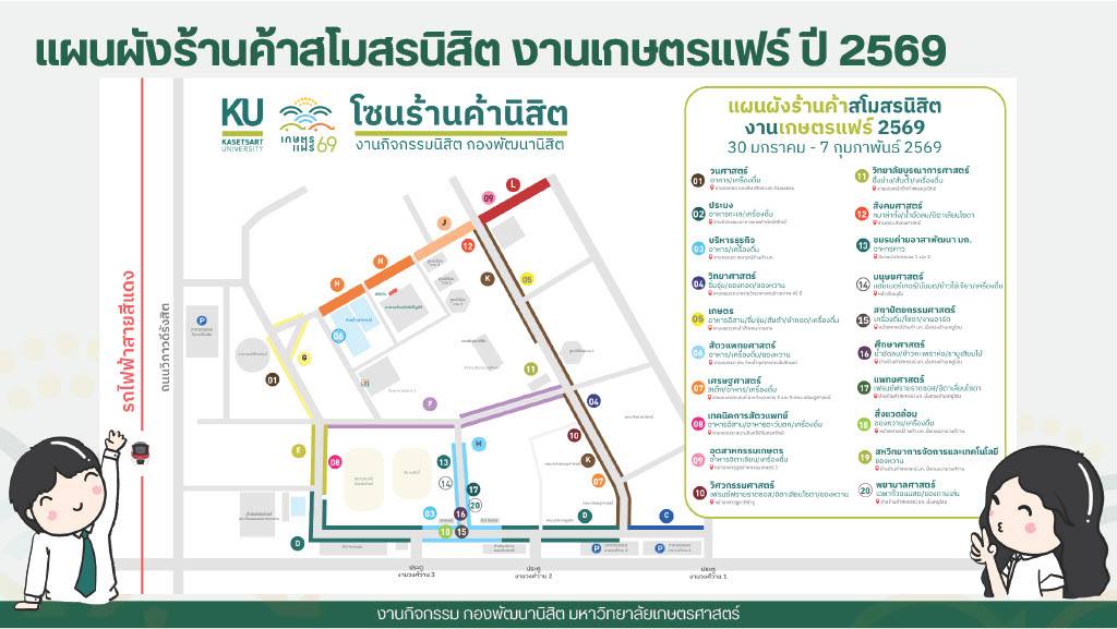 ภายในงานพบกับสินค้าเกษตรคุณภาพ อาหารและผลิตภัณฑ์หลากหลายพร้อมนวัตกรรมและเทคโนโลยีด้านการเกษตร และกิจกรรมส่งเสริมการเรียนรู้อีกมากมาย วันที่ 30 มกราคม – 7 กุมภาพันธ์ 2569 รวม 9 วัน 9 คืน ณ มหาวิทยาลัยเกษตรศาสตร์ บางเขน