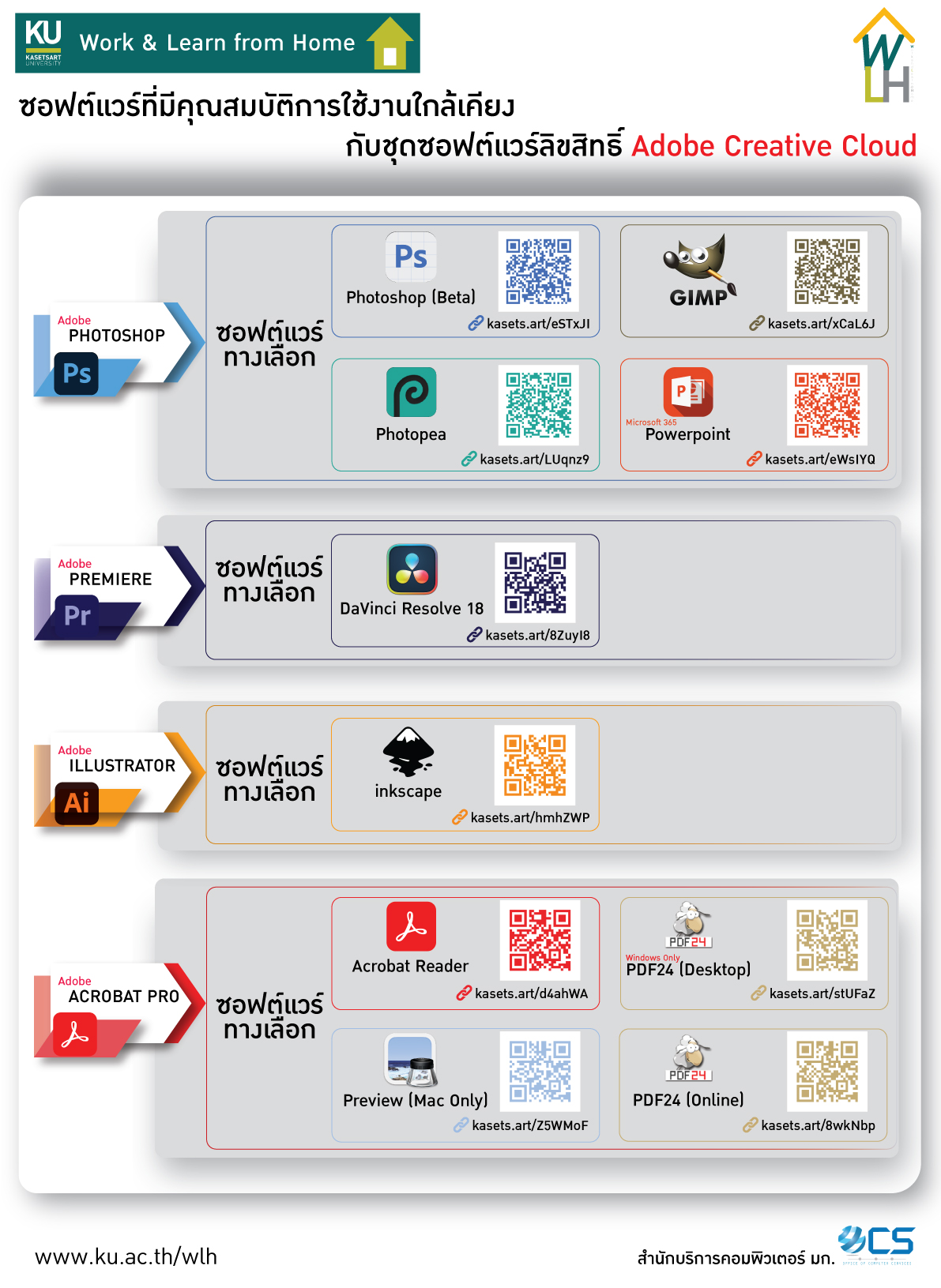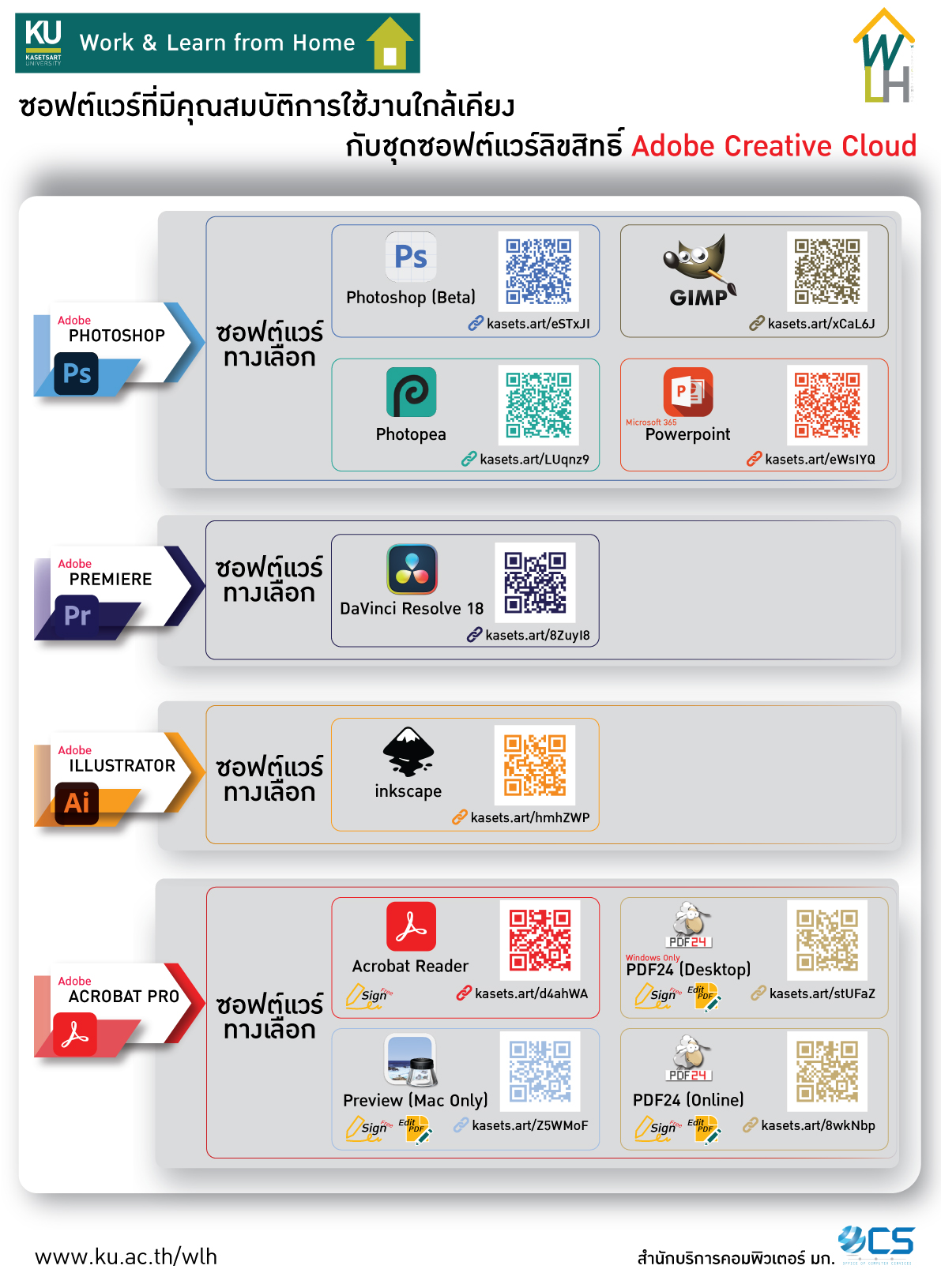 Microsoft 365 สามารถอ่านวิธีดาวน์โหลดได้ที่ https://download.ku.ac.th/Microsoft%20office365.pdf | เหมาะสำหรับการทำโปสเตอร์ แผ่นพับ กราฟิกเพื่อประชาสัมพันธ์ออนไลน์ โดยสามารถย่อขยายง่าย เป็น vector-based ภาพคม เปิดแก้ไขได้ง่าย พิมพ์ออกมาขนาดใดก็ได้ | |
